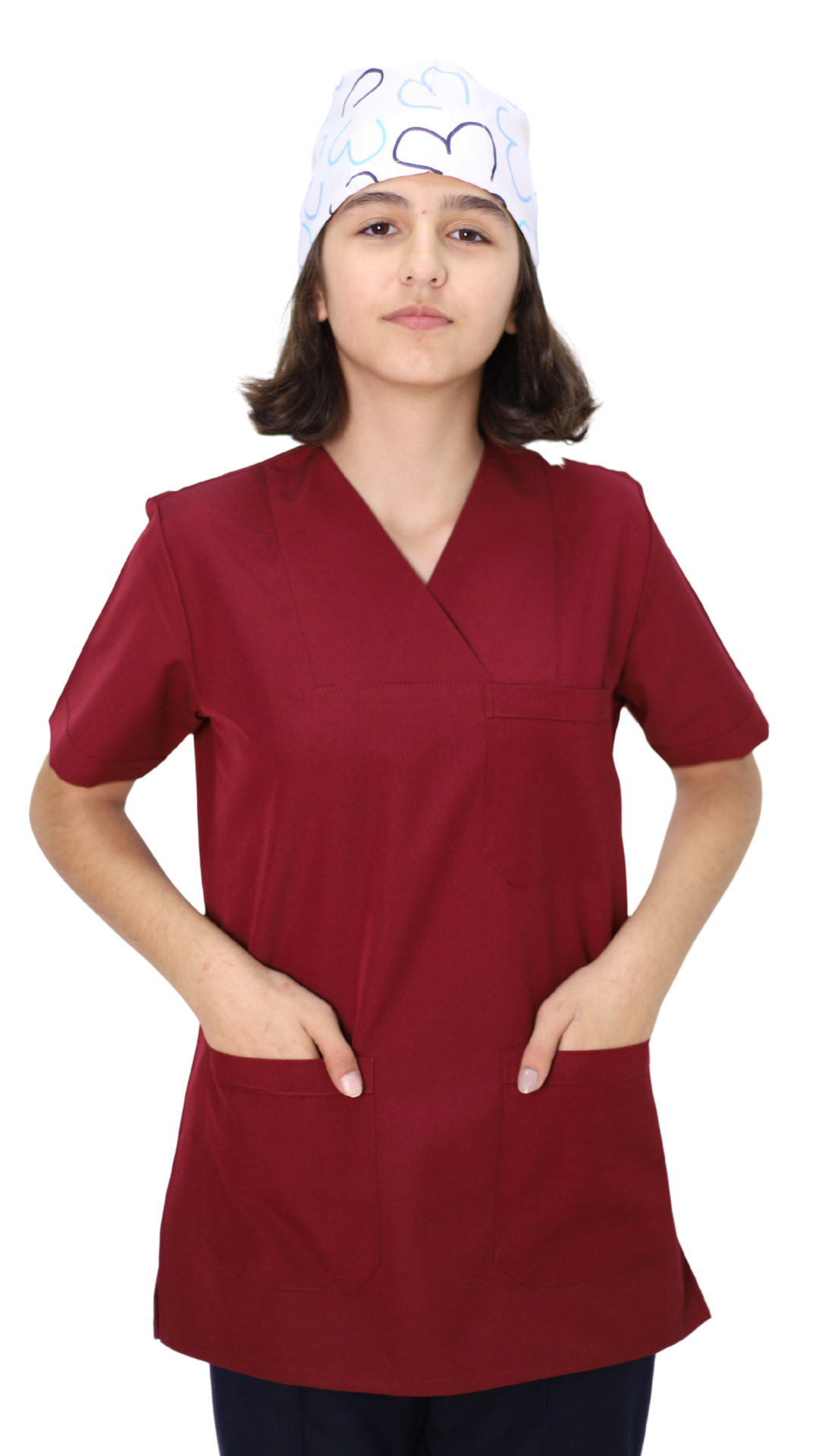 Bordo hastane scrubs modeli, sağlık sektöründe çalışan doktor, hemşire ve diğer sağlık personelleri için özel olarak tasarlanmıştır. Nefes alabilen ve kolay ütülenebilir kumaş yapısıyla gün boyu konfor sağlar. Unisex kalıbı sayesinde kadın ve erkek sağlık çalışanları için uygundur.